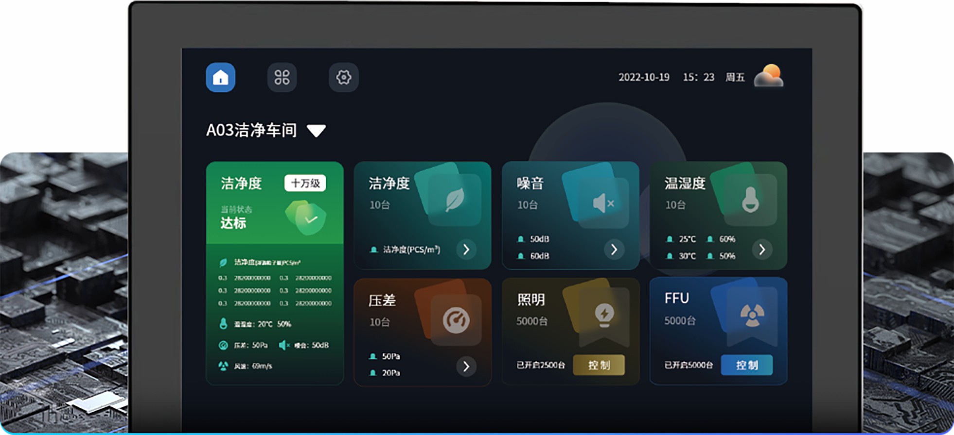 集成控制多种智能设备,包括照明设备、净化设备灯,通过面板上的触摸屏幕来完成各洁净室设备群控。